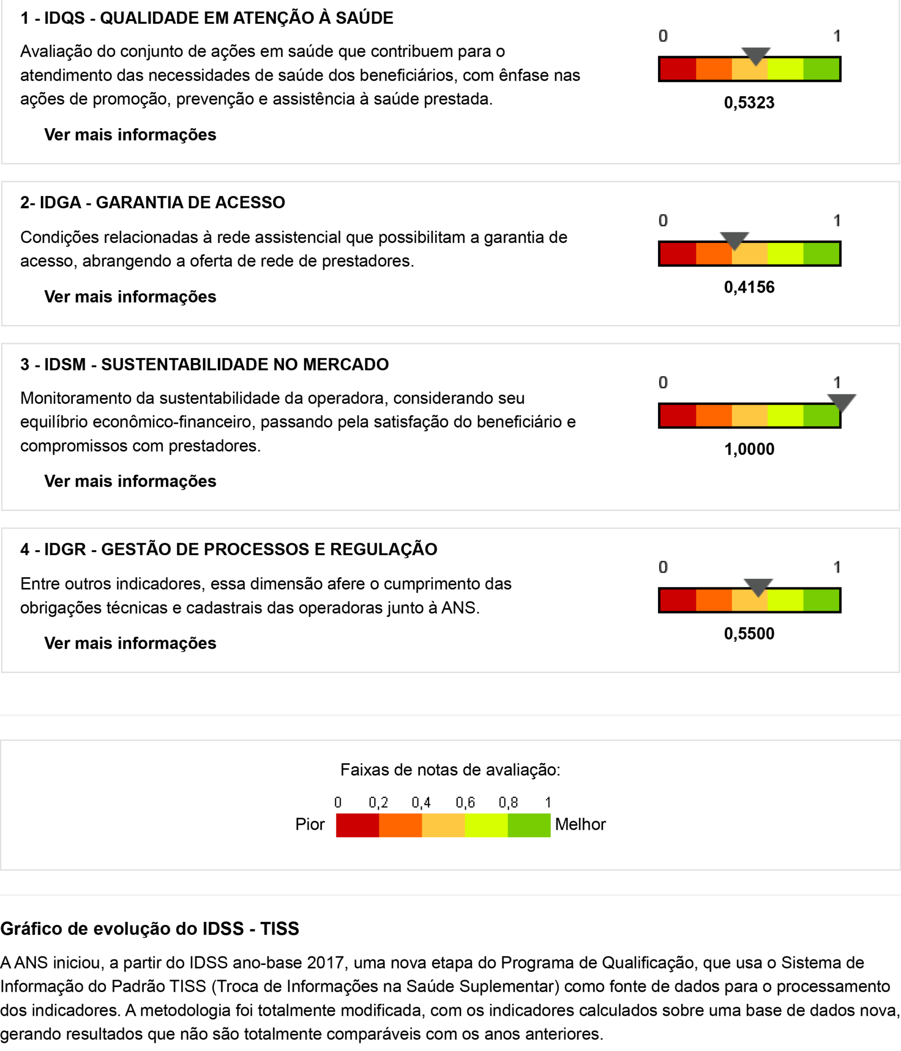 O IDSS é constituído por indicadores que compõem uma nota de 0 (pior) a 1 (melhor), distribuídos em quatro dimensões: Qualidade e Atenção à Saúde, Garantia de Acesso, Sustentabilidade de Mercado, Gestão de Processo e Regulação.